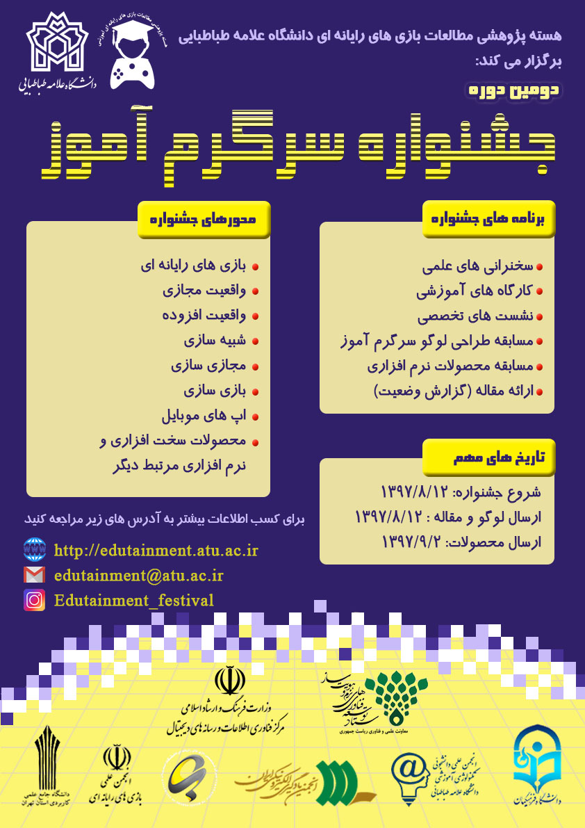دکتر سعید پور روستائی اردکانی دبیر علمی این جشنواره در گفتگو با روابط عمومی دانشگاه ضمن اعلام این خبر گفت: پس از برگزاری موفق اولین دوره جشنواره سرگرم آموز در سال گذشته، هسته پژوهشی مطالعات بازی های رایانه ای آموزشی دانشگاه علامه طباطبائی اقدام به برگزاری دومین دوره این جشنواره در سال جاری نمود. او با اشاره به رویدادهای موردنظر در این جشنواره گفت: در دومین دوره جشنواره، سه رویداد متفاوت شامل: ارائه محصولات سرگرم آموز، ارائه مقالات (گزارش وضعیت) و طراحی لوگو موردنظر قرارگرفته است. او افزود: این جشنواره می تواند به عنوان اولین رویداد دانشگاهی در حوزه سرگرم آموزه ای آموزشی در سطحی گسترده در نظر گرفته شود.
