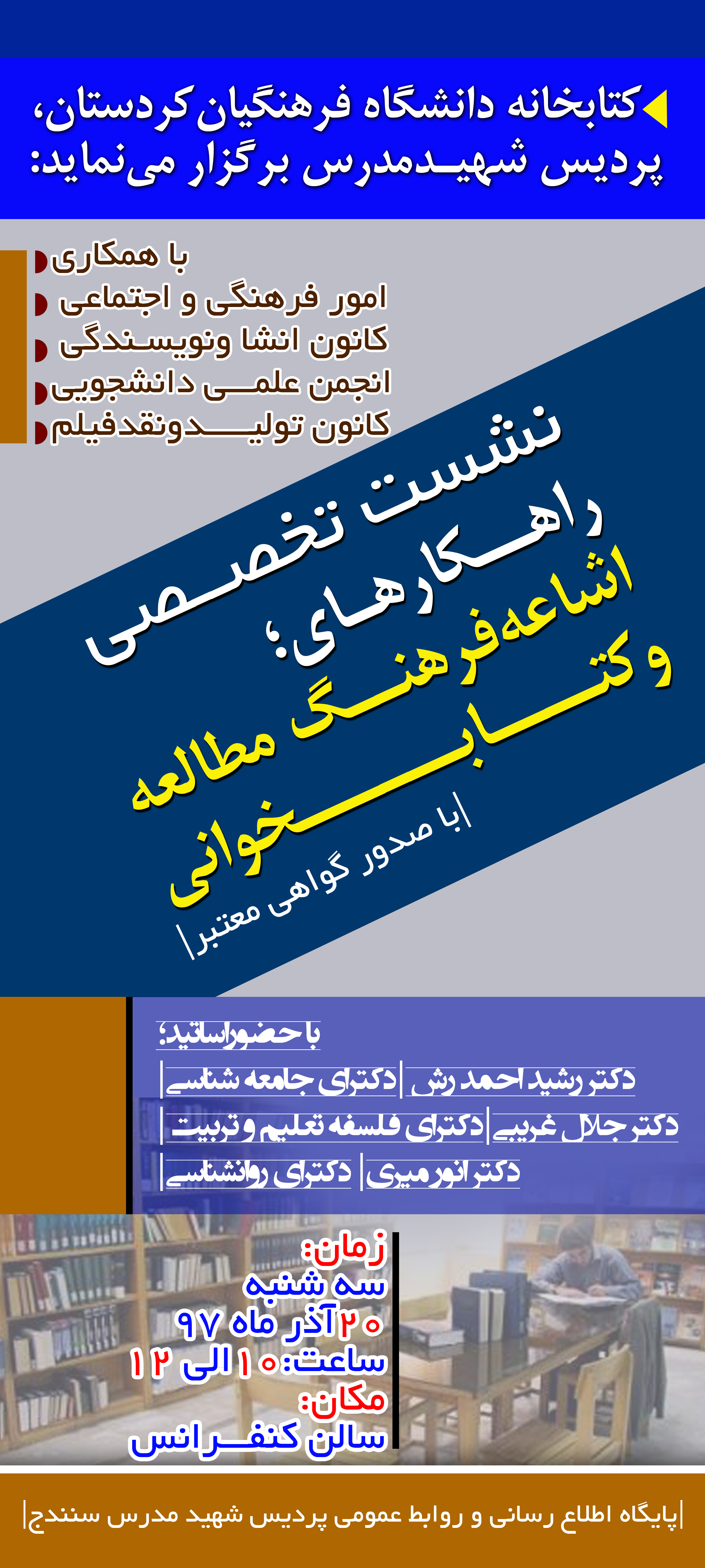 کتابخانه پردیس شهید مدرس سنندج، در راستای اشاعه فرهنگ مطالعه و کتابخوانیِ نو معلمان آتی کشور اقدام به برگزاری سلسه کارگاه ها و نشست های تخصصی نموده است که نخستین نشست تخصصی آن روز سه شنبه مورخ 20 آذر ماه با حضور اساتید ارجمندی چون دکتر رشید احمد رش دکترای حامعه شناسی، دکتر جلال غریبی دکترای فلسفه تعلیم و تربیت، دکتر انور میری دکترای روانشناسی برگزار خواهد شد.