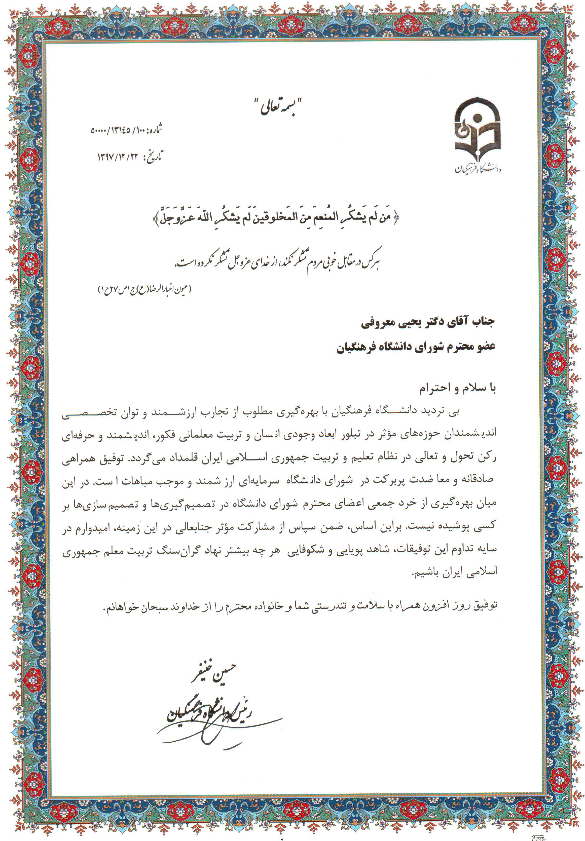 به گزارش روابط عمومی دانشگاه فرهنگیان استان کردستان؛در بیستمین اجلاس سراسری مدیریت های امور پردیس های استانی که با حضور دکتر خنیفر رئیس دانشگاه فرهنگیان،در نوشهر برگزار گردید، دکتر یحیی معروفی مدیر امور پردیس های دانشگاه فرهنگیان استان کردستان برای سومین بار به عنوان نماینده مدیران استانی در شورای دانشگاه انتخاب شد. روابط عمومی دانشگاه فرهنگیان استان کردستان ضمن آرزوی توفیق برای ایشان این موفقیت را به اساتید، کارکنان و دانشجو معلمان تبریک عرض می نماید.متن ابلاغ به شرح زیر می باشد.