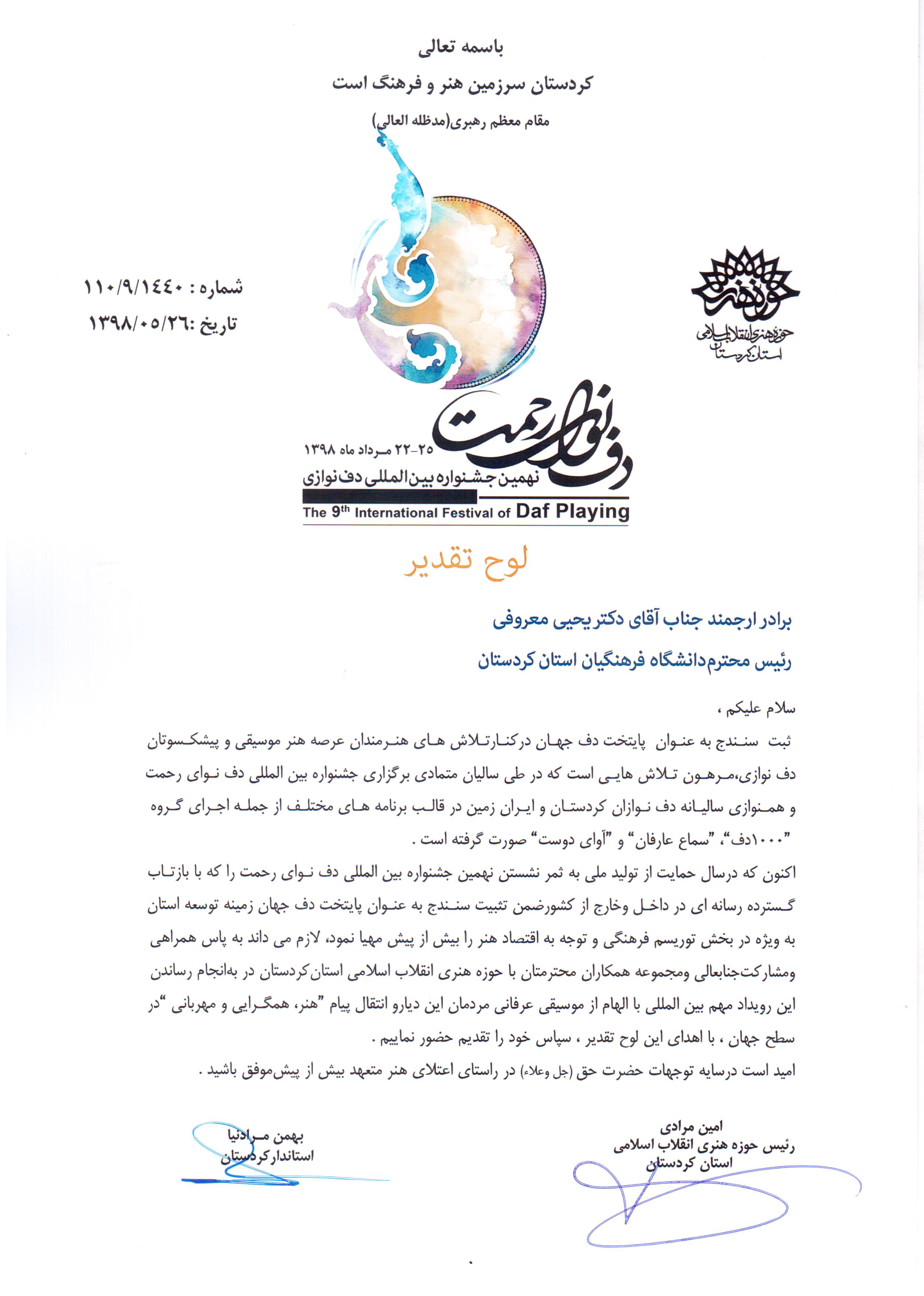 تقـدیر از تلاش های دکتر معـروفی در تثبیت سنندج به عنوان پایتخت دف جهان