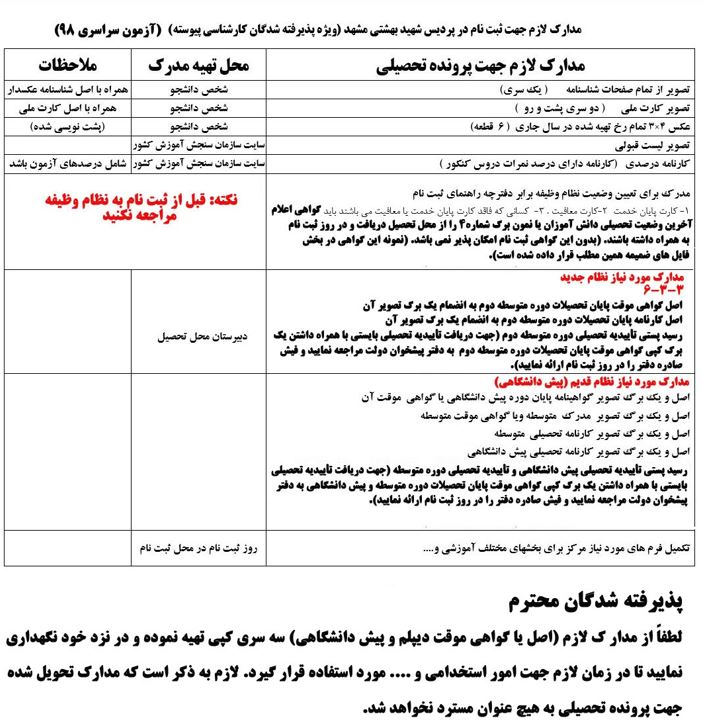 ثبت نام حضوری پذیرفته شدگان آزمون سراسری سال 98 پردیس شهید مدرس