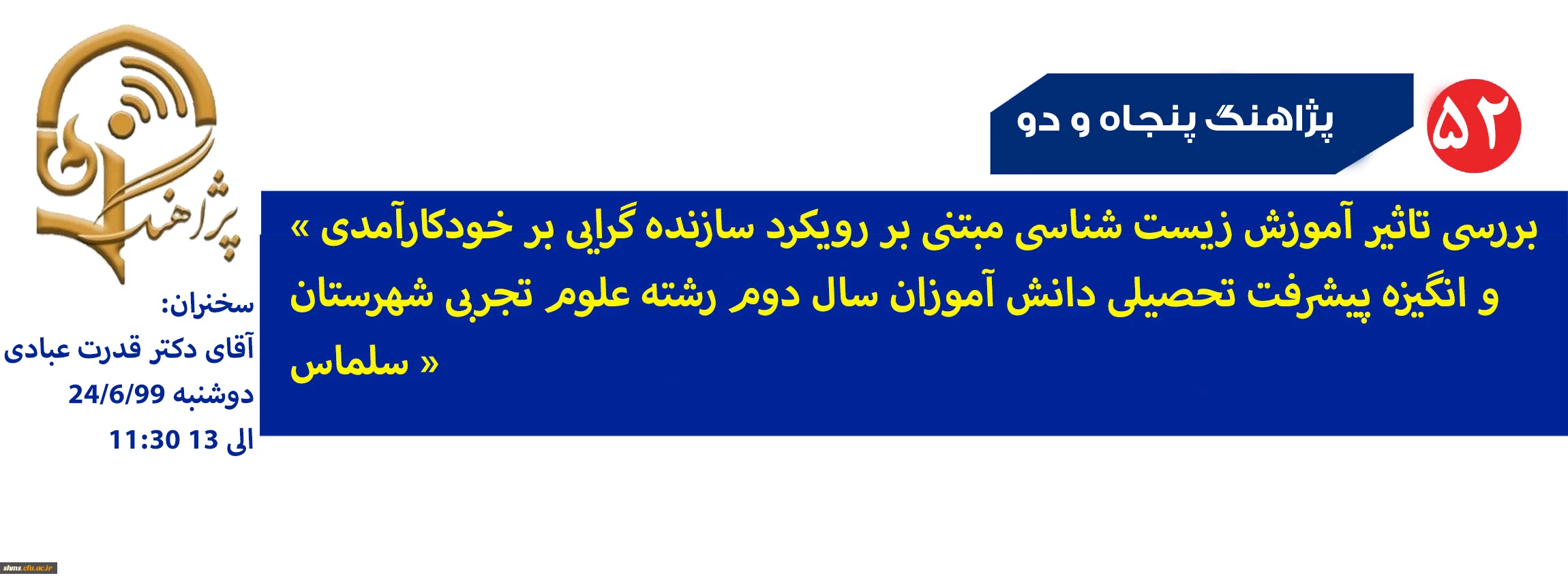 برگزار کننده این سخنرانی مدیریت استان آذربایجان غربی خواهد بود. افراد علاقمند میتوانند به طور مستقیم از طریق سامانه یادگیری الکترونیکی دانشگاه فرهنگیان به آدرس lms.cfu.ac.ir در این سخنرانی شرکت کنند. در ضمن کلیه شرکتکنندگان (دانشجو معلم، استاد، کارشناس) میتوانند با استفاده از کد ملی به عنوان نام کاربری و کلمه عبور وارد این سامانه شوند. شایان ذکر است که پژآهنگ این هفته بر مبنای طرح پژوهشی سخنران محترم است.