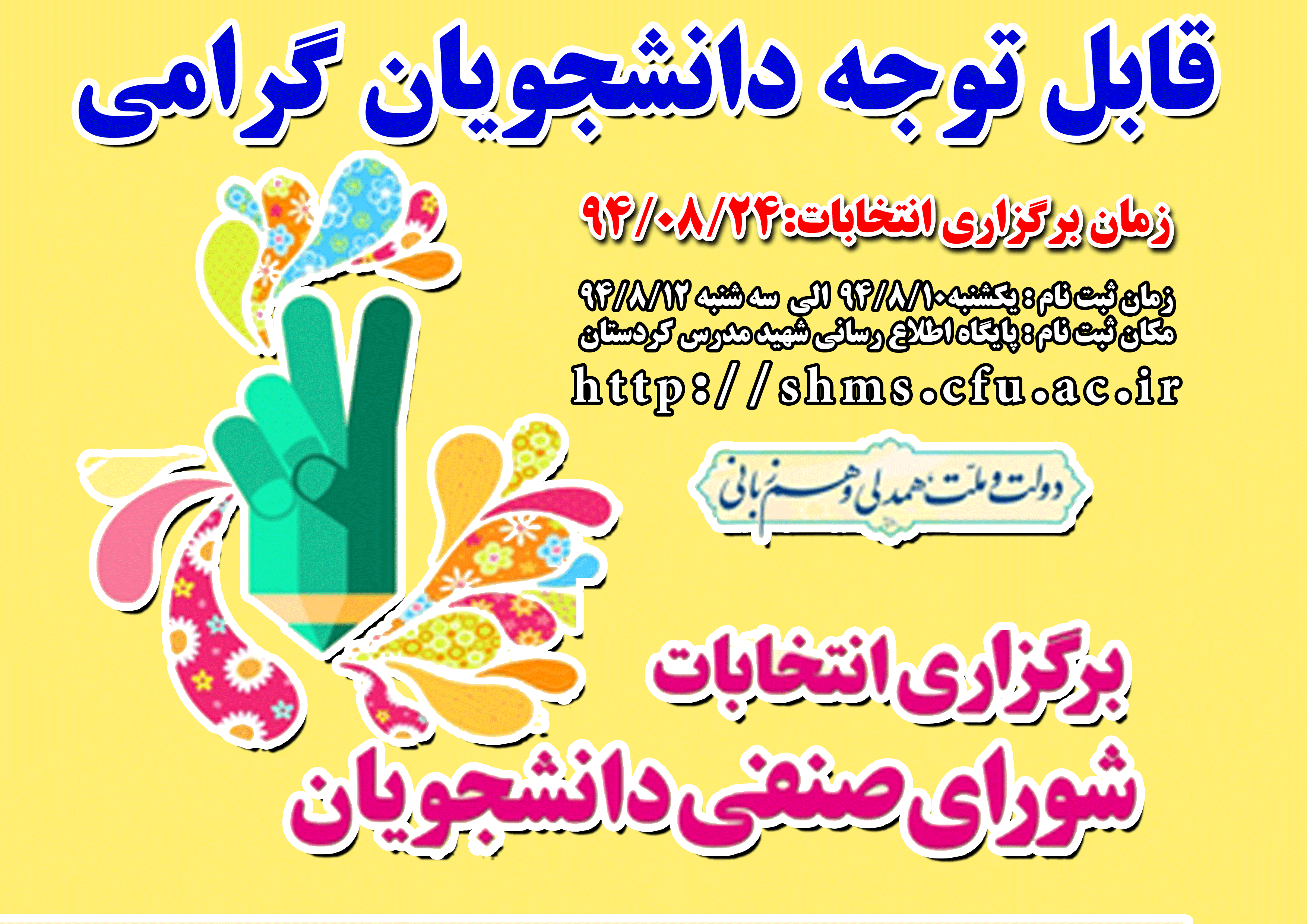 زمان برگزاری انتخابات:روز یک شنبه مورخ 94/8/24 مکان کتابخانه پردیس شهید مدرس کردستان