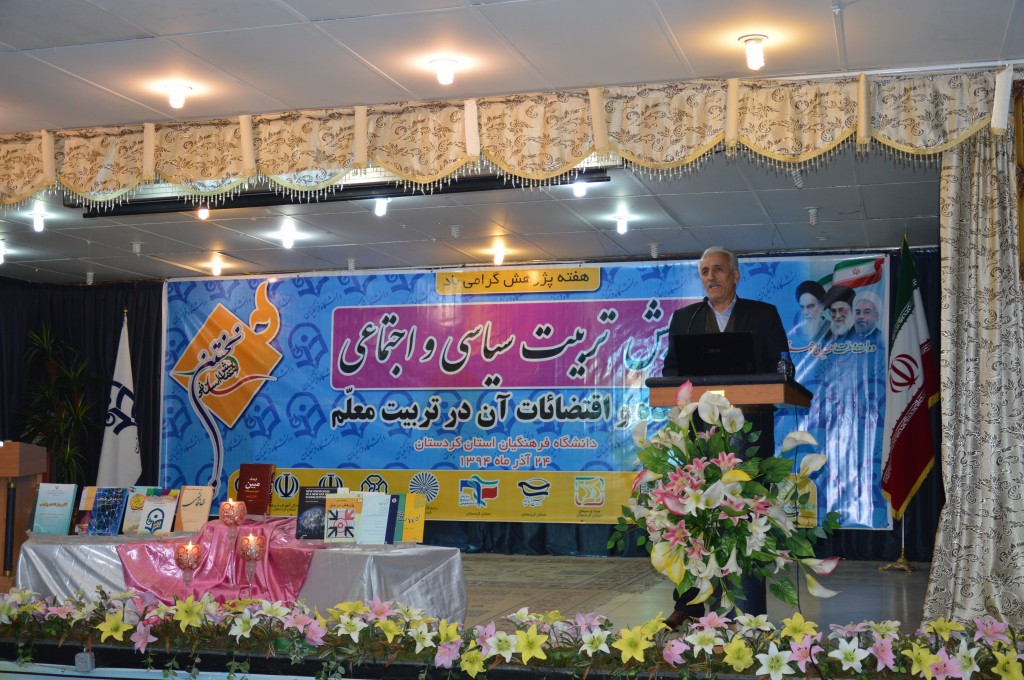 نخستین همایش تربیت سیاسی و اجتماعی، جایگاه و اقتضائات آن در تربیت معلم، روز سه شنبه مورخ ۲۴ آذر 1394 به مناسبت هفته ی پژوهش هم زمان با استان های: زنجان، خوزستان، خراسان رضوی، خراسان شمالی، خراسان جنوبی، گیلان، فارس، قزوین، ایلام، یزد، خوزستان و چهارمحال و بختیاری، به میزبانی پردیس شهید مدرس دانشگاه فرهنگیان کردستان و با مشارکت: دانشگاه کردستان، دانشگاه آزاداسلامی سنندج، پیام نور و بسیج دانشجویی استان برگزار شد.