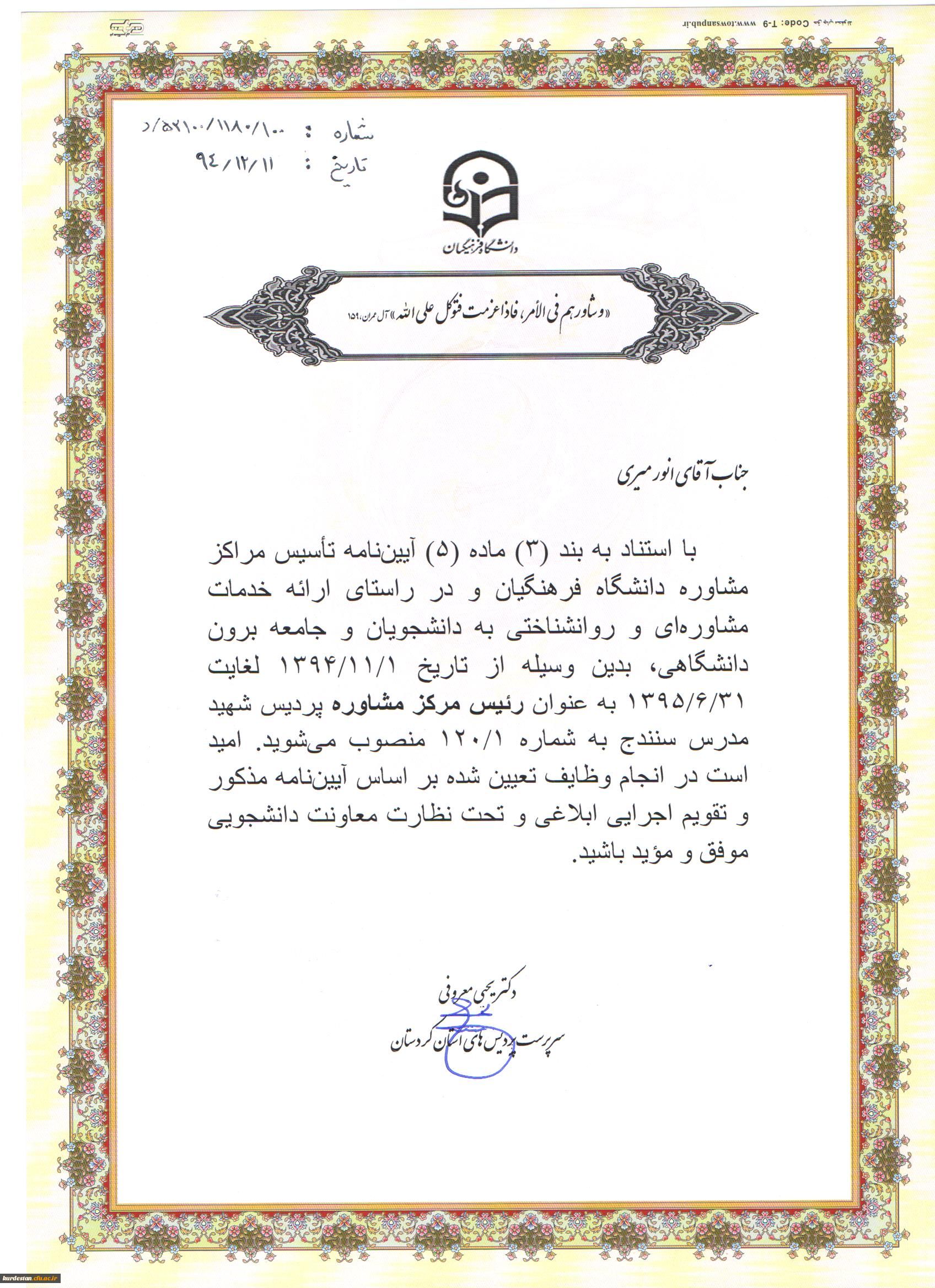 در پایان مراسم مجوز حکم مشاوره، توسط دکتر کریمی به دکتر انور میری اهداو از فعالیتهای مجدانه همکاران خدوم طی اهدا لوح تقدیری توسط ایشان تجلیل به عمل آمد.