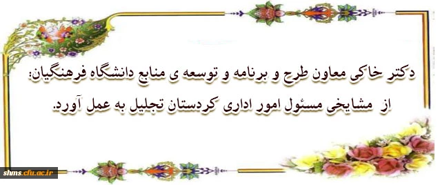 طی حکمی دکتر خاکی معاون طرح و برنامه و توسعه ی منابع دانشگاه فرهنگیان: از تلاش های جناب آقای مشایخی مسئول امور اداری کردستان تجلیل به عمل آورد. 2