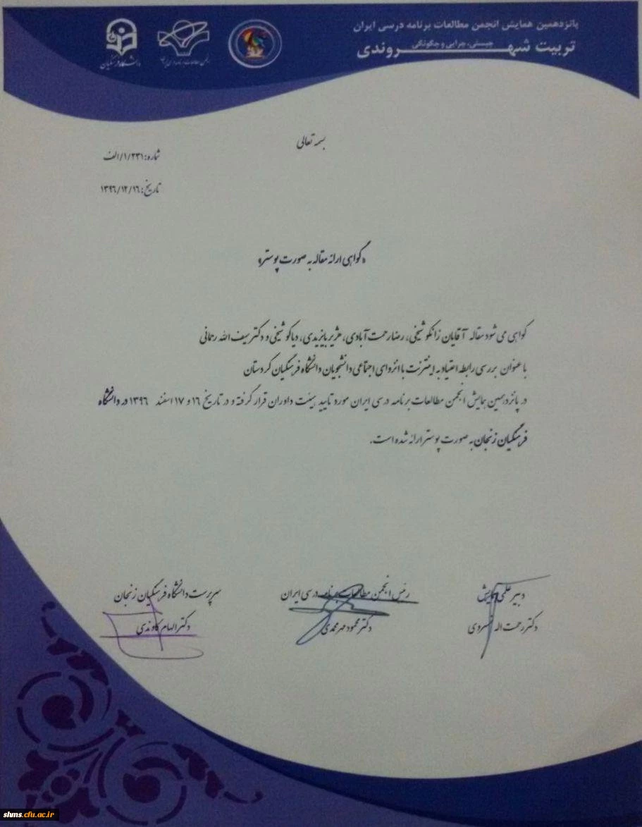 پیام تبریک : راهیابی مقاله دانشجویان شهید مدرس کردستان در پانزدهمین همایش انجمن مطالعات درسی 2