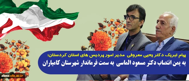 امتیاز دهید : پیام دکتر یحیی معروفی؛ به یمن انتصاب دکتر مسعود الماسی به سمت فرماندار شهرستان کامیاران 2 چهارشنبه 9 خرداد 1397 ساعت 12:26