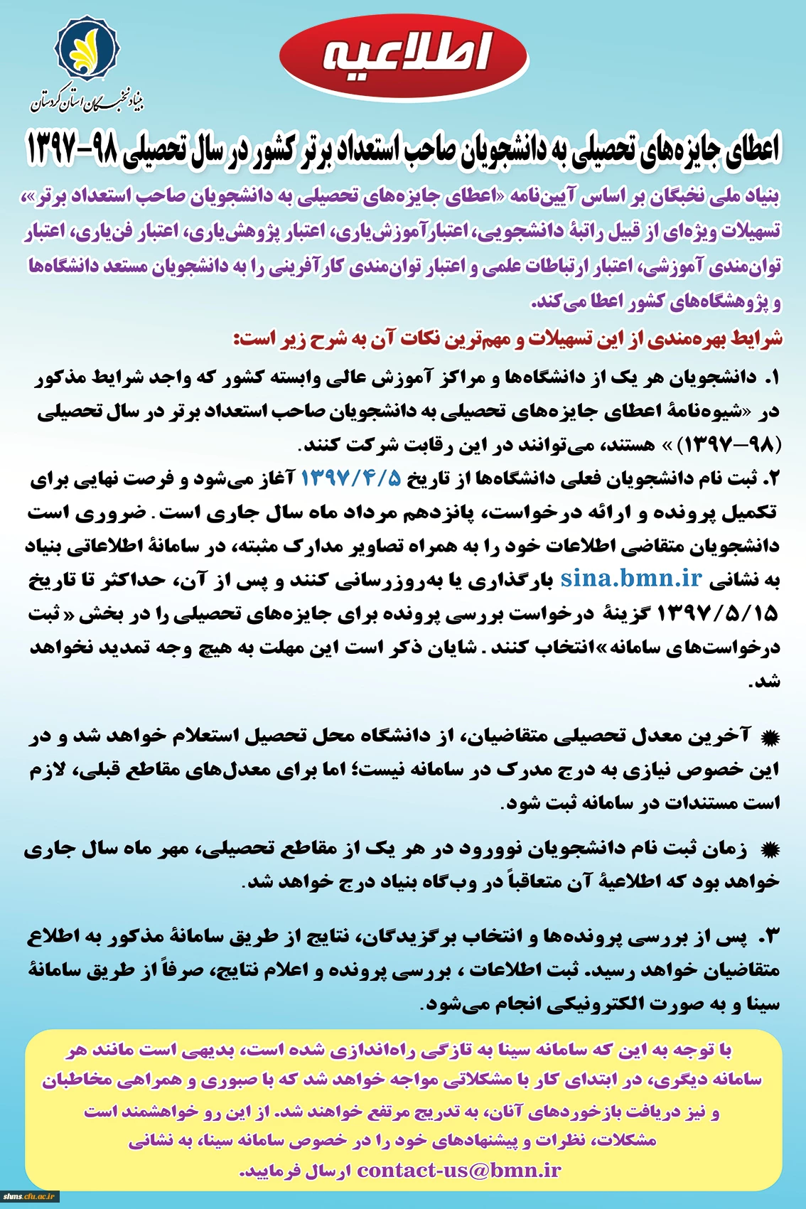 بنیاد نخبگان استان کردستان: شیوه نامه اعطای جایزه های تحصیلی به دانشجویان صاحب استعداد برتردر سال تحصیلی 97-1396 2