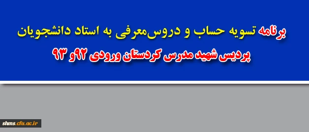 امتیاز دهید : برنامه تسویه حساب و دروس معرفی به استاد دانشجویان؛ پردیس شهید مدرس کردستان ورودی 92و 93 2 دوشنبه 12 شهریور 1397 ساعت 11:23