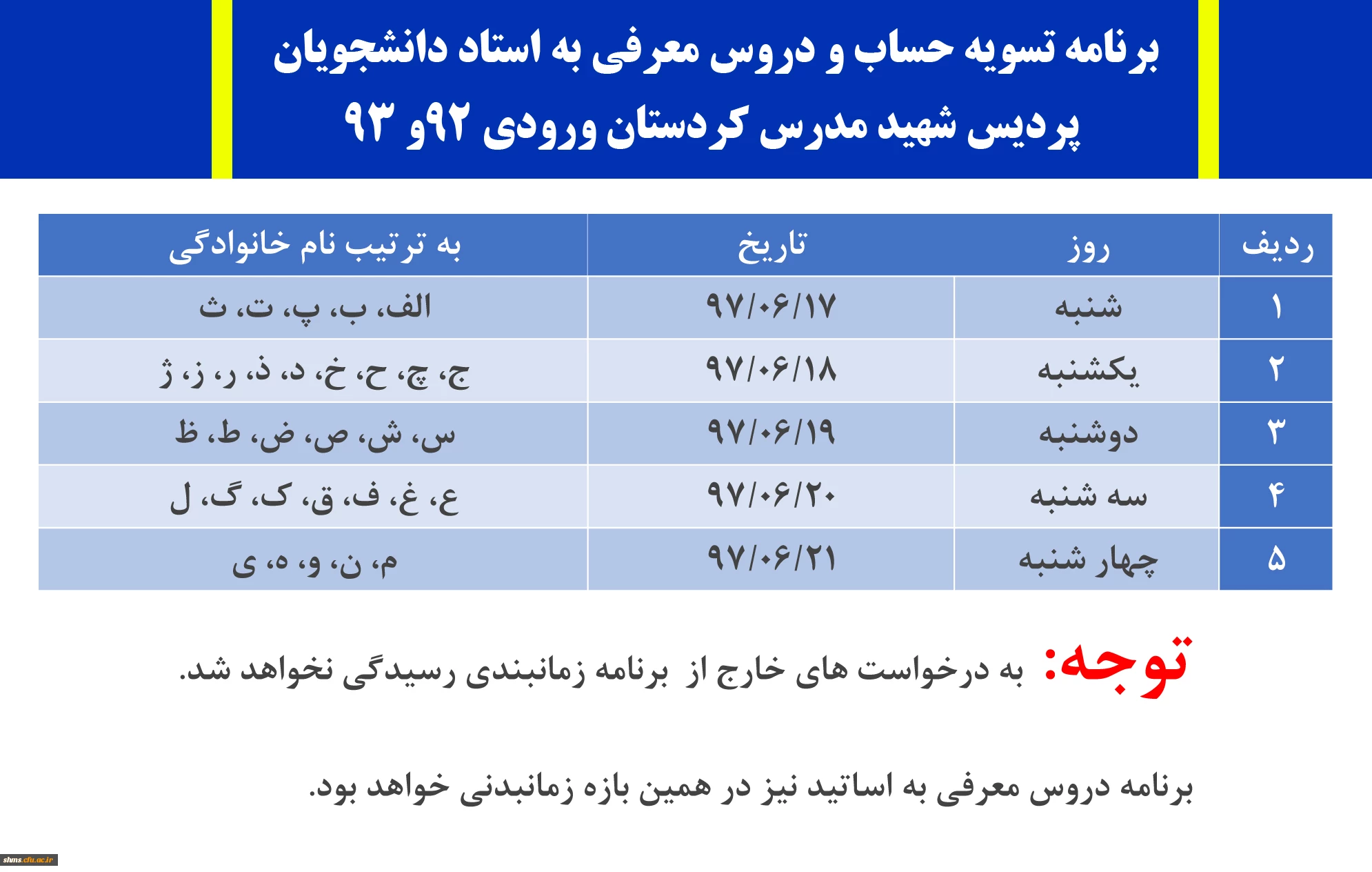 برنامه تسویه حساب و دروس معرفی به استاد دانشجویان؛ پردیس شهید مدرس کردستان ورودی 92و 93 2