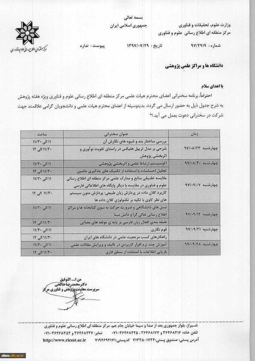 امتیاز دهید : سخنرانی اعضای محترم هیأت علمی مرکزمنطقه ای اطلاع رسانی علوم و فناوری ویژه هفته پژوهش 2 سهشنبه 15 آبان 1397 ساعت 14:23