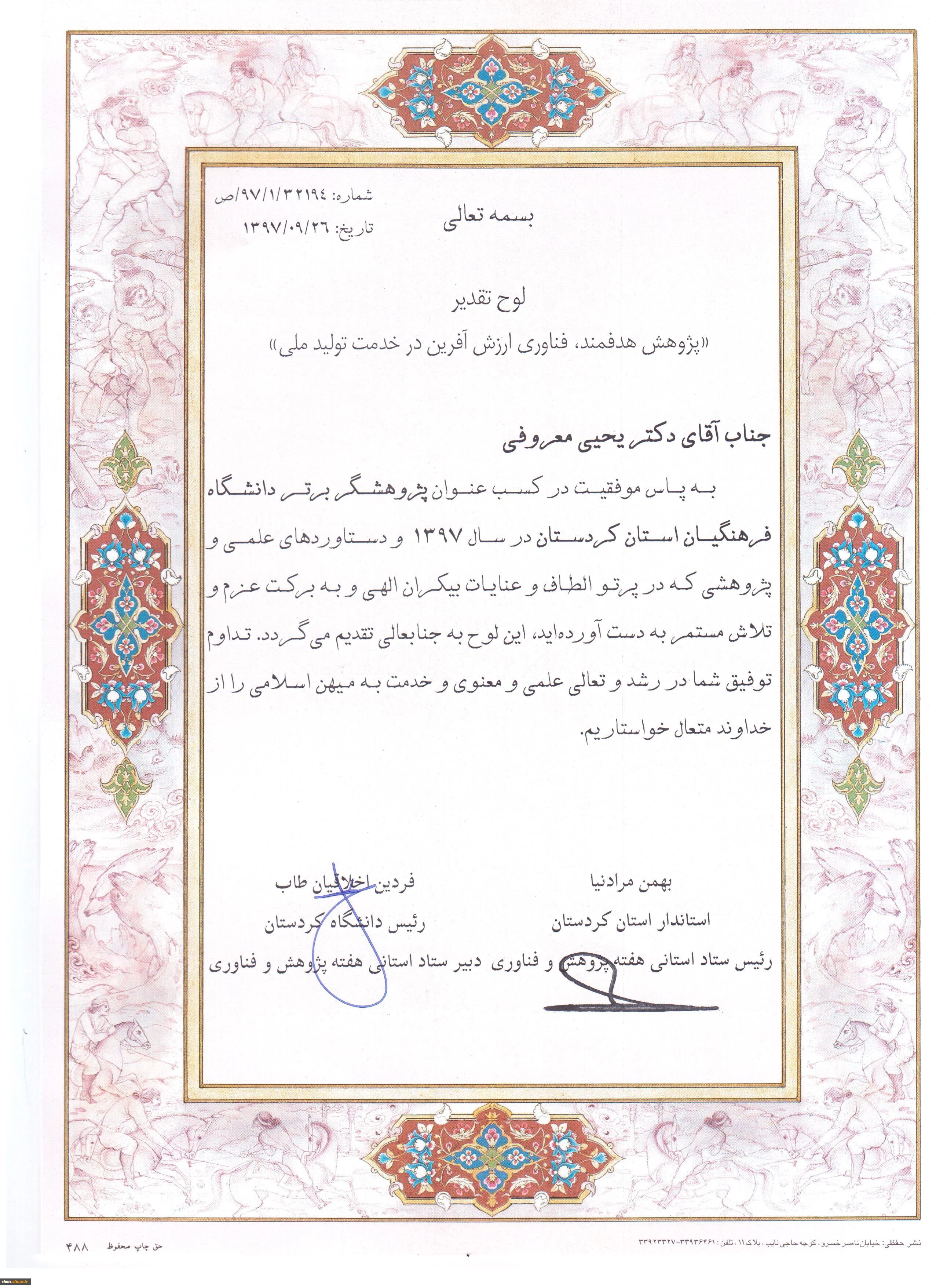 تجلیل از دکتر معروفی به عنوان پژوهشگر برتر دانشگاه فرهنگیان استان کردستان 2