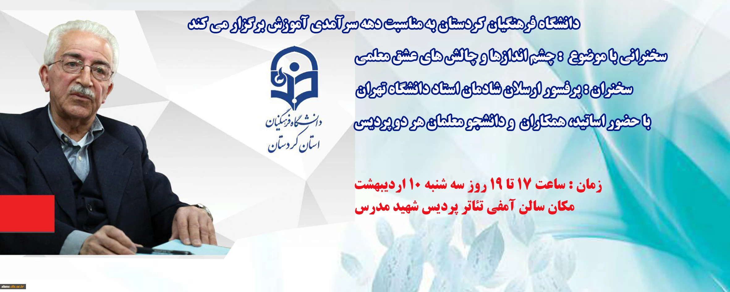 دانشگاه فرهنگیان کردستان به مناسبت دهه سرآمدی آموزش برگزار می کند سخنرانی با موضوع : چشم اندازها و چالش های عشق معلمی 2