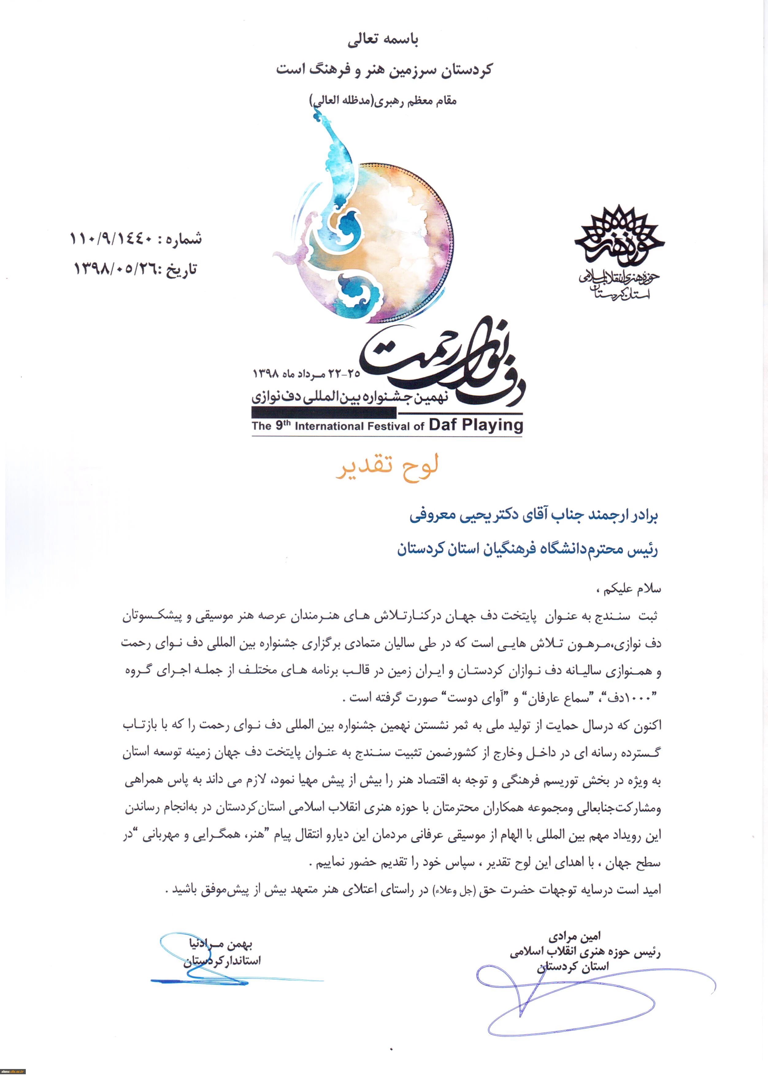 امتیاز دهید : تقـدیر از تلاش های دکتر معـروفی در تثبیت سنندج به عنوان پایتخت دف جهان 3 دوشنبه 11 شهریور 1398 ساعت 12:20