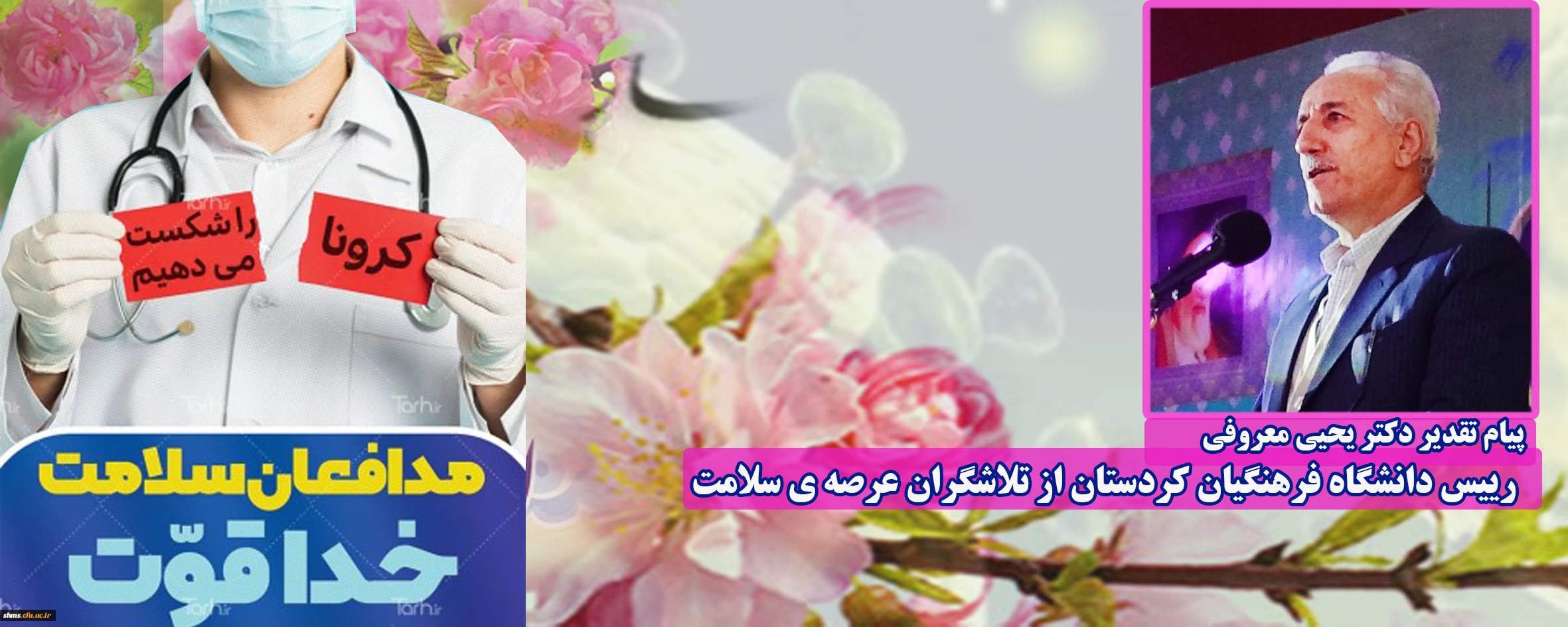 امتیاز دهید : پیام تقدیر دکتر یحیی معروفی رییس دانشگاه فرهنگیان کردستان از تلاشگران عرصه ی سلامت 2 شنبه 9 فروردین 1399 ساعت 13:05