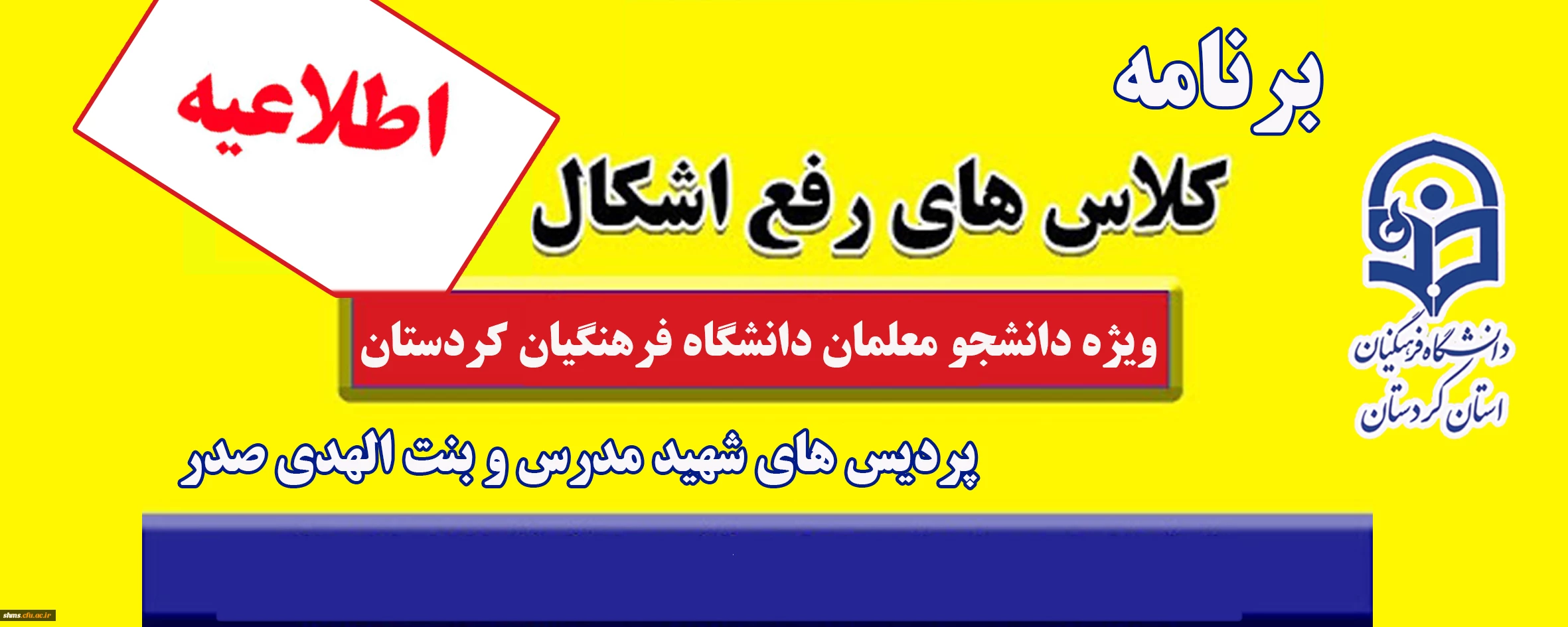 امتیاز دهید : برنامه کلاس های رفع اشکال پردیس های دانشگاه فرهنگیان استان کردستان 2 شنبه 17 خرداد 1399 ساعت 14:14