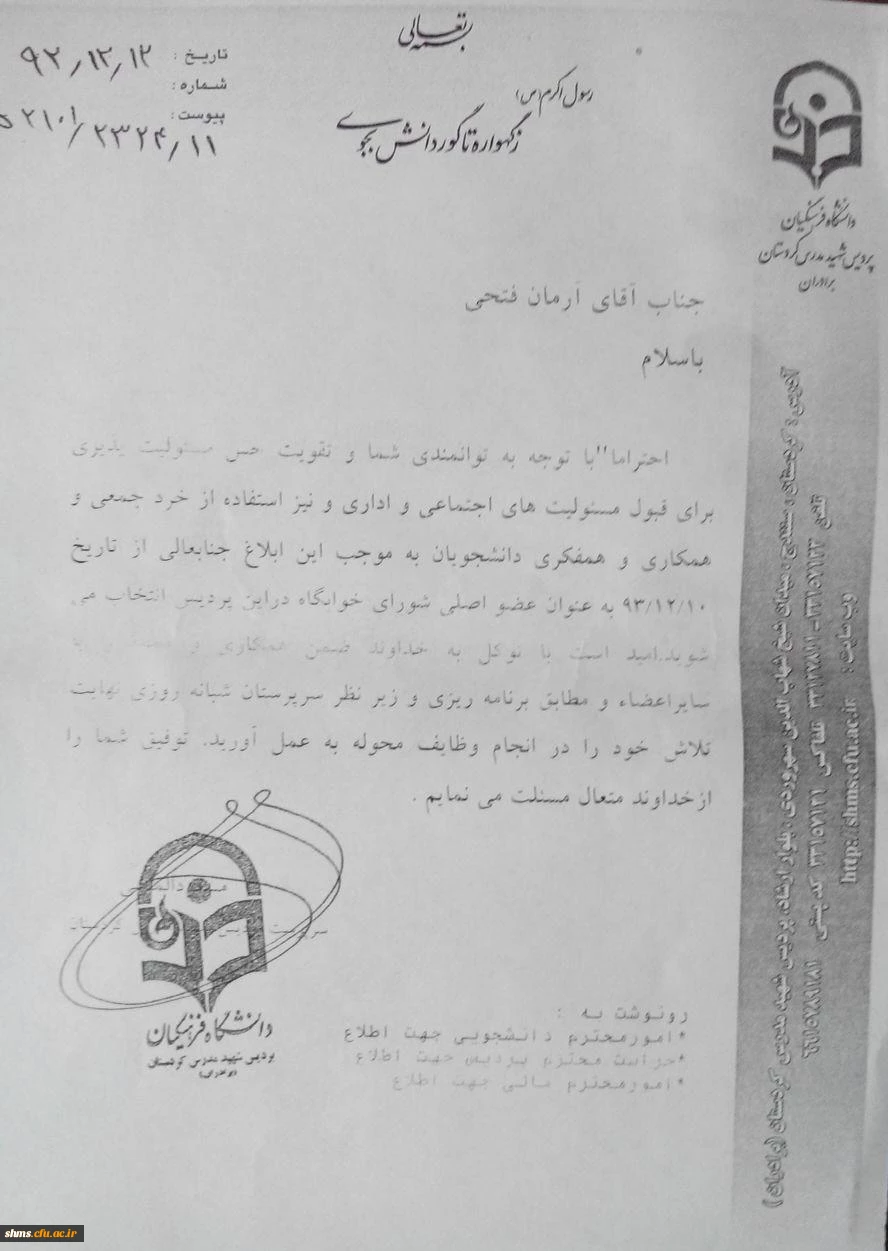 امتیاز دهید : شورای کوی دانشگاه طی ابلاغ جدا گانه ای از سوی دکتر مسعود الماسی کار خود را آغار نمود. 2 شنبه 26 اردیبهشت 1394 ساعت 20:57